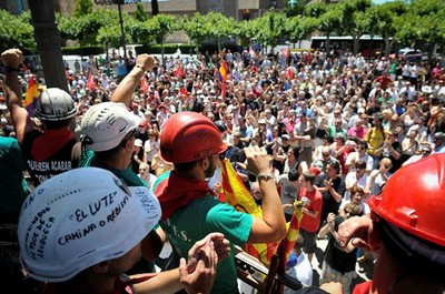 8 de julio de 2012.- La marcha de mineros españoles del carbón, denominada marcha negra, se acerca a Madrid (capital), donde el próximo día 11 esperan celebrar una gran manifestación en protesta por los recortes al sector aplicados por el Gobierno de Mariano Rajoy.