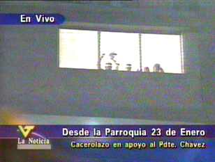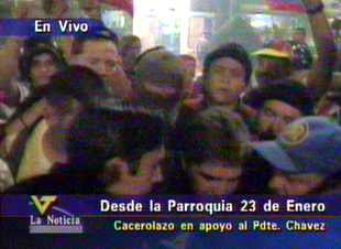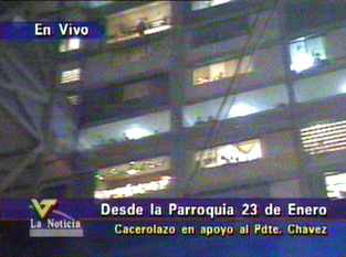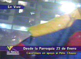 - Colectivo "Opinión Libre": Por mas de media hora continua ha estado sonando un fuerte cacerolazo, cohetonazo, aliprimerazo, etc en los sectores aledaños al Mirador del Este, El Morro, La Linea, El Nazareno, parroquia Petare del Municipio Sucre Estado Miranda. Cuando hace apenas hora y media se escucho un cacerolasito en apoyo al parito, los sectores populares salieron a manifesta su apoyo al Proceso de Cambios liderado por el presidente Chavez y han estado desde las 9: y media caceroleando y lanzando fuegos artificiales, poniendo musica de Ali Primera todo volumen, en fin una verdadera fiesta popular..... SOMOS MAYORIA!!!!!!!!!