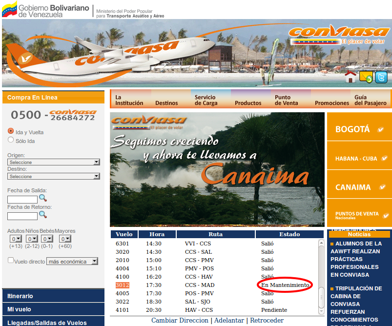 29 de agosto de 2012.- Según se pudo conocer a través de la red social Twitter, el vuelo V0 3012 de Conviasa con destino a Madrid que partiría el día de hoy a las 5:30pm fue suspendido y, según comentan usuarios de la aerolínea, se difirió su partida para este jueves a las 6pm. En el sitio web de la aerolínea venezolana se pudo corroborar la situación, pues en el itinerario de vuelos aparece el 3012 con el estado "En Mantenimiento". Hasta el momento no se ha conocido un comunicado oficial de la empresa, por lo que se desconoce la causa exacta de esta suspensión.