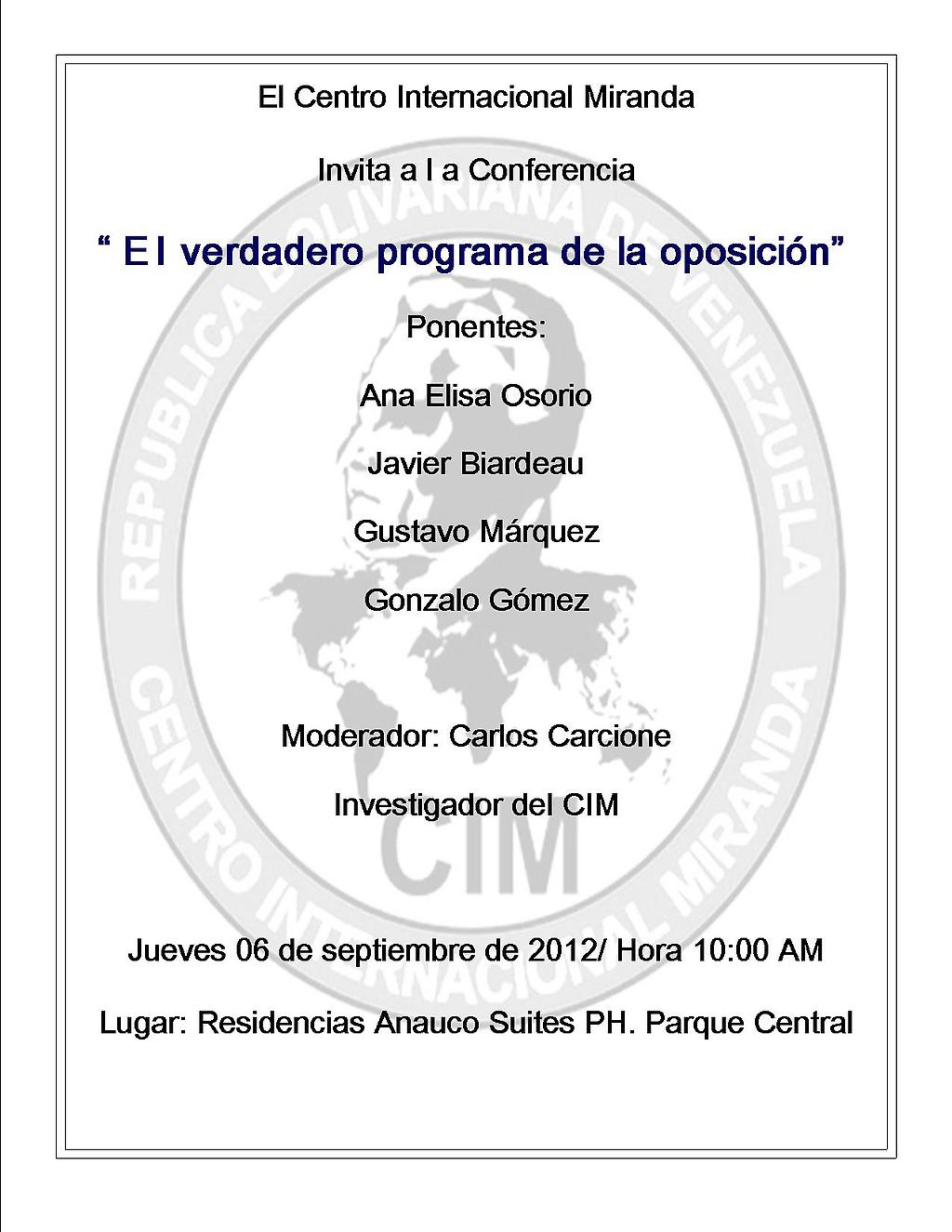 El Centro Internacional Miranda, en el seguimiento de estos acontecimientos de actualidad y en su calificado espacio de análisis, crítica y debate, invita a la Conferencia “El verdadero programa de la oposición”, con los ponentes: Ana Elisa Osorio, Javier Biardeau, Gustavo Márquez y Gonzalo Gómez; con la moderación de Carlos Carcione, Investigador del CIM. Será este Jueves 06 de septiembre de 2012/ Hora 10:00 AM, en la sede del CIM: Residencias Anauco Suites PH. Parque Central.