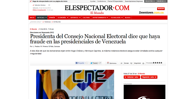 Caracas, octubre 6 - En nota aparecida en la edición digital del diario colombiano El Espectador, y firmada por L. Prados y Maye Primera (venezolana), quienes son asalariados del diario español El País, de donde al parecer el rotativo bogotano toma la información, se lee el siguiente titular: Presidenta del Consejo Nacional Electoral dice que haya fraude en las presidenciales de Venezuela.