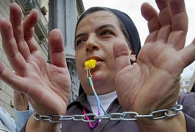 16/10/12.-Unas monjas italianas se encadenaron las manos como señal de protesta frente a la sede del gobierno en la Plaza San Giacomo de Nápoles (sur del país) por no recibir fondos para financiar sus trabajos de voluntariado en el extranjero.