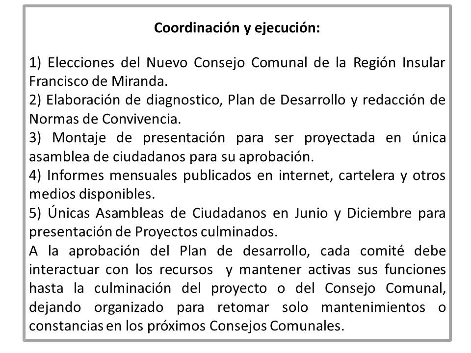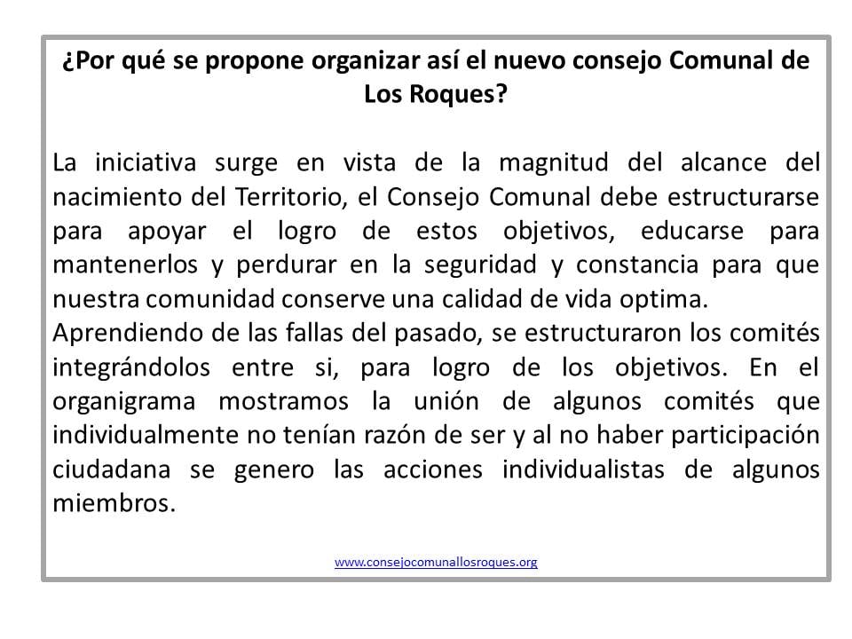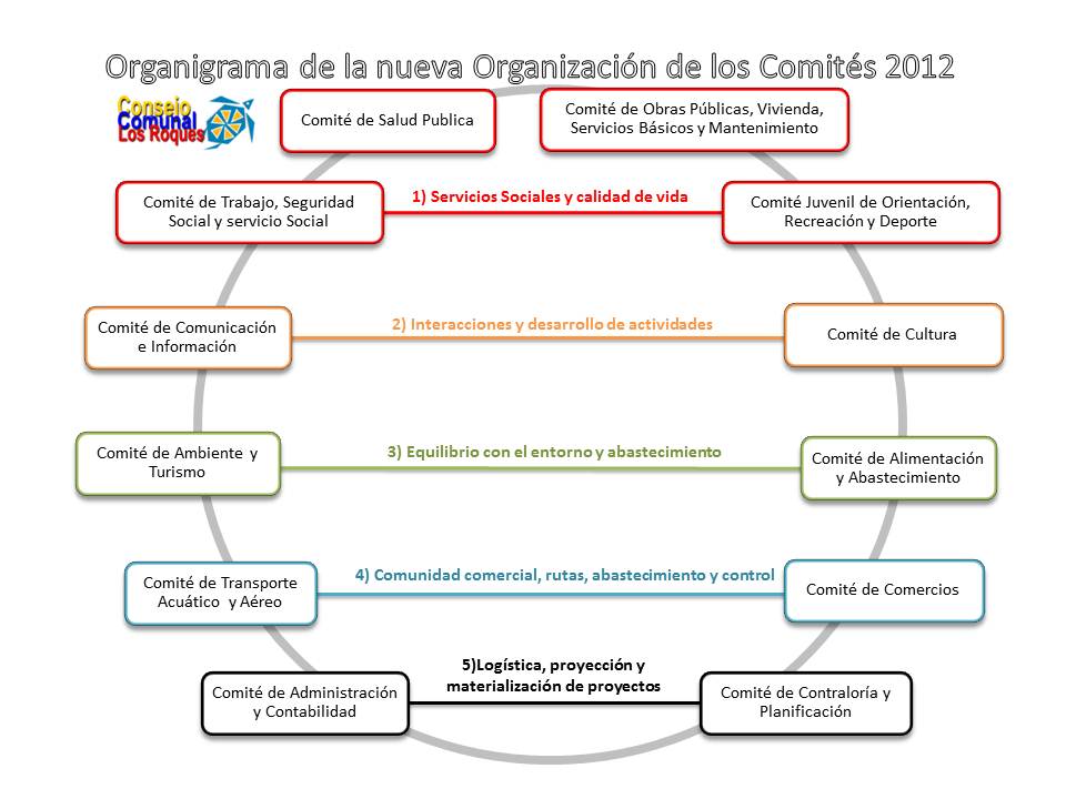 ZM: ¿Cómo se interrelacionan los distintos comités en esta nueva manera de organizar el Consejo Comunal de la Isla Los Roques?IG: En el organigrama se aprecia como los comités a su ves se relacionan entre 3 o 2 comités, sin que ello conlleve a la toma de decisiones individuales, ya que para que los proyectos no choquen o alguien interfiera en las funciones de otro, todo debe pasar por reuniones generales entre todos los comités y con el apoyo y la integración en los proyectos en general que se registren en el "Comité de Contraloría y Planificación", que en principio deberá coordinar las reuniones breves y directas con material ya editado para que los demás comités puedan darle forma e interactuar entre si para proponer y organizar sus funciones. El apoyo del comité de "Comité de Contraloría y Planificación" es el "Comité de Administración y Contabilidad" quienes deberán velar porque los proyectos sean factibles, compatibles y administrativamente posibles.