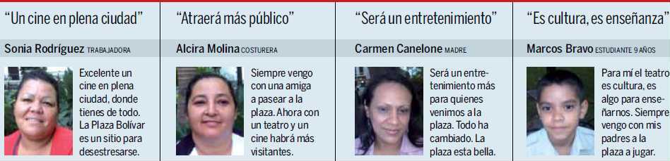 La señora Carmen Deus de Negrín, de nacionalidad española, tiene 46 años vendiendo cotufas a todos los visitantes de la Plaza Bolívar, caraqueños y turistas nacionales e internacionales, en un local ubicado en la planta baja del Edificio Rialto, que ahora será el Teatro Bolívar. “A la gente le gusta la cotufa tradicional. Me gusta tratar con el público. Crié a mis hijos con lo que obtengo de este kiosco”, comenta Carmen, y agrega: “estoy emocionada porque voy a trabajar en el Teatro Bolívar”. Recordó que en el sitio había un relojero, y antes la actriz Bárbara Teide también atendía el local.
