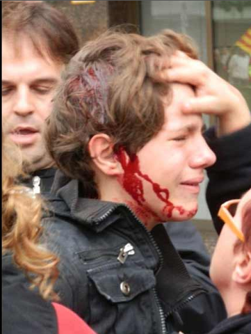 14/11/12.-La policía arremetió violentamente contra un menor de edad durante la huelga general en España, en un primer momento la policía dijo que fue una piedra de los mismos manifestantes, las imágnes dicen la verdad.