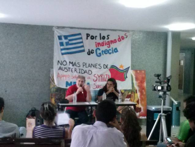 16 de noviembre de 2012.- El día de ayer en la escuela de historia de la UCV Marea Socialista con la colaboración del colectivo Praxis, realizó un foro-debate para compartir impresiones con los estudiantes acerca del desarrollo de la lucha en los países Europeos. En la actividad se contó con la participacion como ponentes de Carlos Carcione ( Investigador del CIM) y Cesar Romero (Juventud de Marea Socialista)