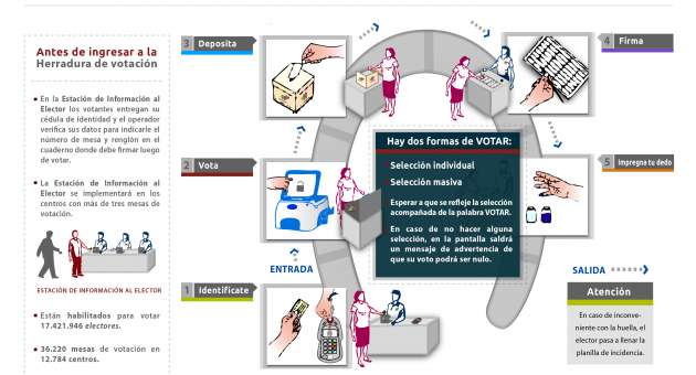 Luego de cumplir con la tarea de información y verificación, los electores pasarán a votar en la herradura de votación, el circuito que con cinco pasos le permite a los 17 millones de ciudadanos habilitados elegir a sus gobernadores y representantes a los consejos legislativos.