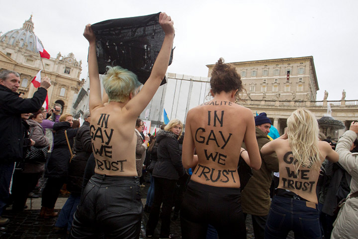 13/01/13.-Varias mujeres se desnudaron el torso el domingo en la Plaza de San Pedro en protesta por la oposición del Vaticano al matrimonio entre homosexuales.