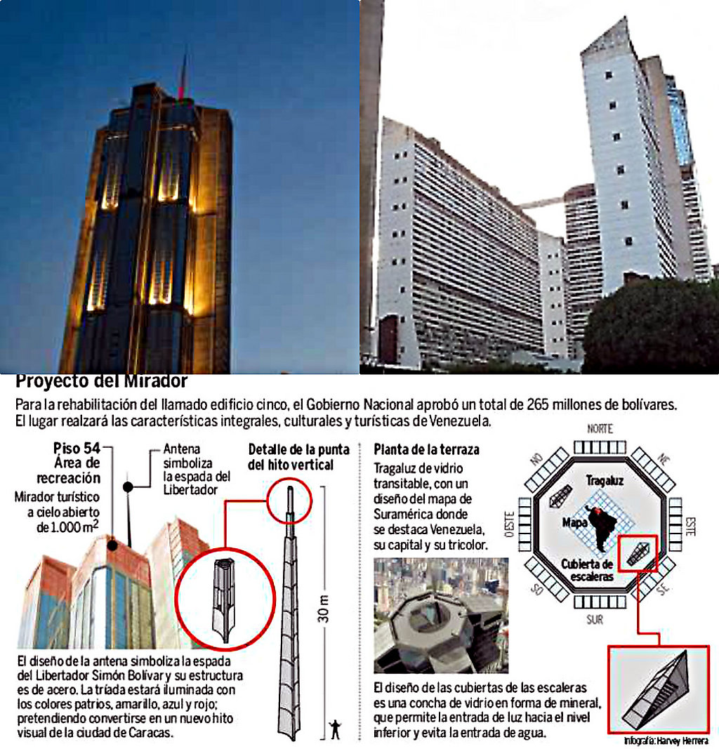 Los colores patrios provienen de un elemento arquitectónico colocado en la cima de la edificación, que simboliza la espada del Libertador, que tiene una altura de 45,6 metros, informó ayer Nataly Ramírez, presidenta de la junta liquidadora del Centro Simón Bolívar (CSB), ente adscrito a la Vicepresidencia de la República.