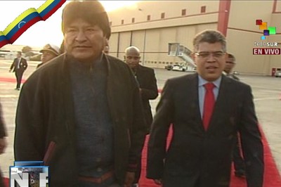 El presidente Morales es el tercer mandatario latinoamericano que pisa tierras venezolanas este miércoles para participar, junto al pueblo venezolano, en los actos oficiales de despedida del presidente Chávez. Horas antes, aterrizaron en Maiquetía el presidente de Uruguay, José Pepe Mujica, y de Argentina, Cristina Fernández.