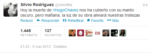 Caracas, marzo 6 - Entre los numerosos mensajes que a través de la red social Twitter se pueden leer, está el emitido por el trovador cubano Silvio Rodríguez a través de su cuenta @silviofilia: