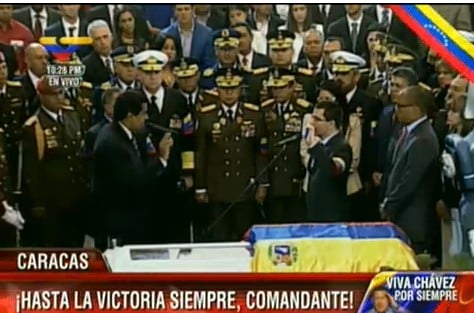 "Compañeros civiles y militares, juramos desde nuestro corazón de patriota que seremos leales al comandante Hugo Chávez, y haremos valer sus palabras y sus órdenes; que seremos fieles a su legado político, que daremos nuestra vida entera por construir la patria socialista independiente, que nos convertiremos en protectores de los pobres y trabajaremos porque nuestro pueblo avance hacia la felicidad verdadera.