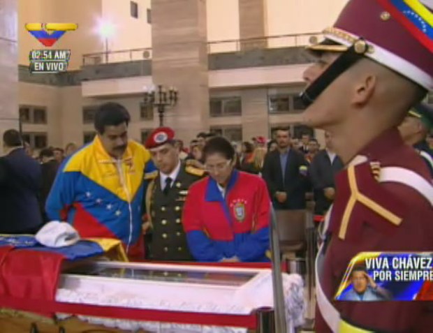En imágenes transmitidas por Venezolana de Televisión se pudo apreciar que Maduro, Jaua y Flores se acercaron al féretro donde reposan los restos mortales del líder socialista, fue allí cuando el Presidente Encargado puso una gorra del equipo Navegantes del Magallanes, el favorito de Chávez, sobre el ataúd.