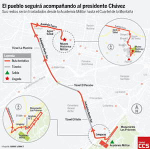 El ministro de Relaciones Interiores y Justicia, Néstor Luis Reverol, indicó que la cita es en la avenida Los Próceres donde se podrá observar el tramo inicial del traslado del féretro. Para ello informó que quienes asistan, desde tempranas horas, podrán colocarse en las gradas que se encuentran a ambos lados del paseo.