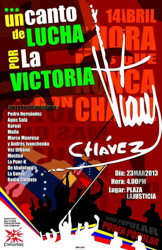 Hugo Chávez, Presidente de la República Bolivariana de Venezuela, siempre se caracterizó por el reconocimiento a las expresiones culturales, artísticas y tradicionales como la forma más sincera de hacer Patria. Por ello, los grupos, poetas y cantores se reúnen para honrar su memoria, su legado y su obra revolucionaria en éste “Canto por la Victoria” en la Plaza de la Justicia de Barquisimeto, luego de las 04:00 de la tarde del sábado 23 de marzo del año en curso.