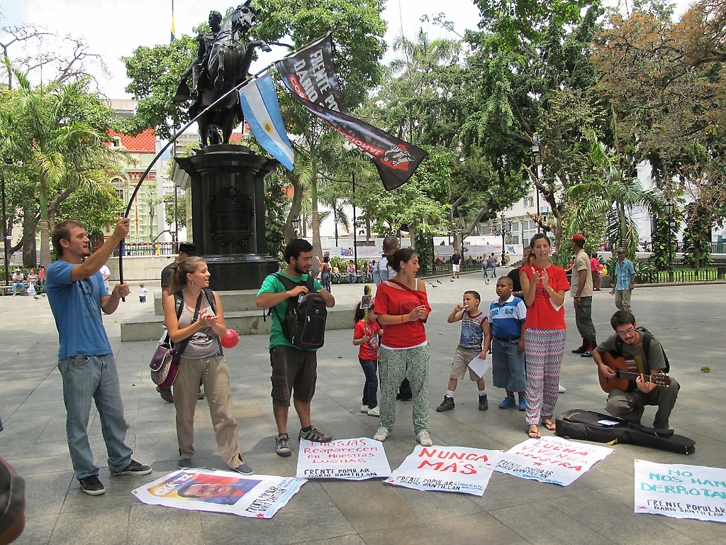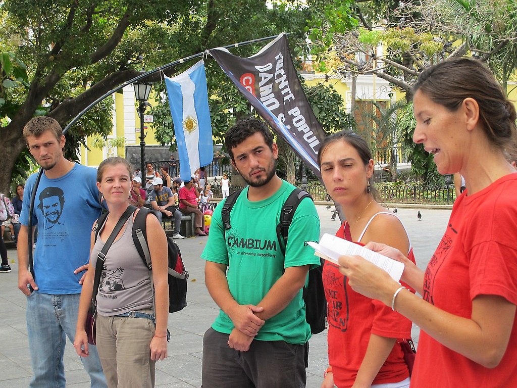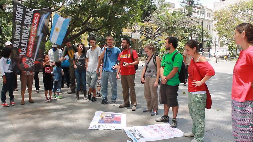Al mediodía, en la plaza Bolívar, acompañados por gente del pueblo que espontáneamente se sumó a compartir nuestras palabras, un compañero y una compañera del Frente Popular Darío Santillán - Corriente Nacional explicaron el sentido de la convocatoria, recordando lo que significó la dictadura cívico militar en Argentina. El Terrorismo de Estado en Argentina fue parte del Plan Cóndor impulsado por el imperialismo para el Cono Sur, dejando un saldo de miles de personas asesinadas y desaparecidas, junto a un modelo económico dirigido a sumir a nuestros países en la miseria y la dependencia del capitalismo.