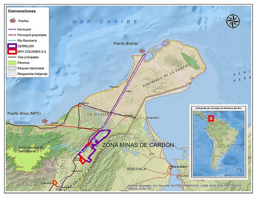 La empresa opera en 800 kilómetros cuadrados en la península de La Guajira y en límites con Venezuela. Una vía férrea propia atraviesa el istmo hasta Puerto Bolívar, también exclusivo, sobre el mar Caribe.
