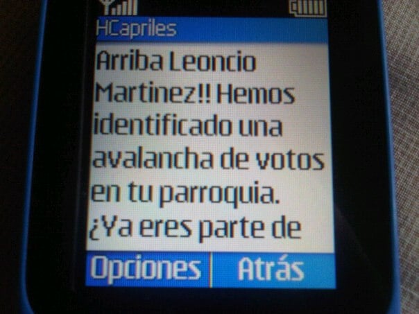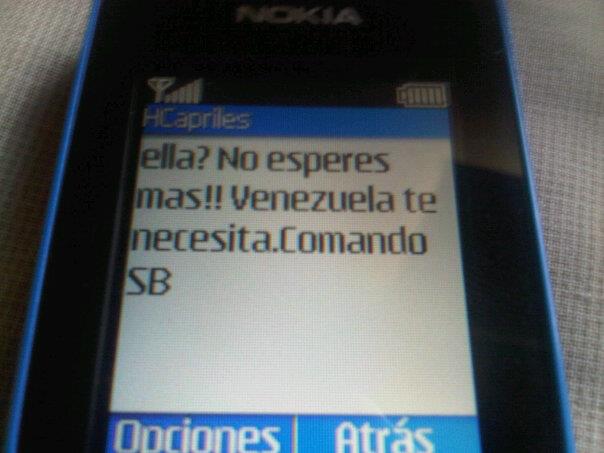 14 de abril de 2013.- Hemos detectado que el comando de campaña opositor "Simón Bolívar", mientras se muestra como un grupo de inocentes corderitos al denunciar supuestas irregularidades y ventajismos durante la jornada electoral, está haciendo campaña en paralelo, motivando al voto por medio de la mensajería de texto a nombre de Henrique Capriles.