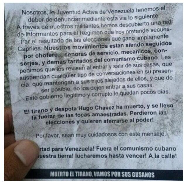 La agrupación fascista pretende impulsar el asedio contra choferes, señoras de servicio, mecánicos y conserjes. "Les pedimos que los revisen al entrar y salir de sus casas, que suspendan cualquier tipo de conversaciones en su presencia, que mantengan a sus hijos alejados de ellos, y que de ser posible, no los dejen entrar a sus casas", dice una parte del texto.