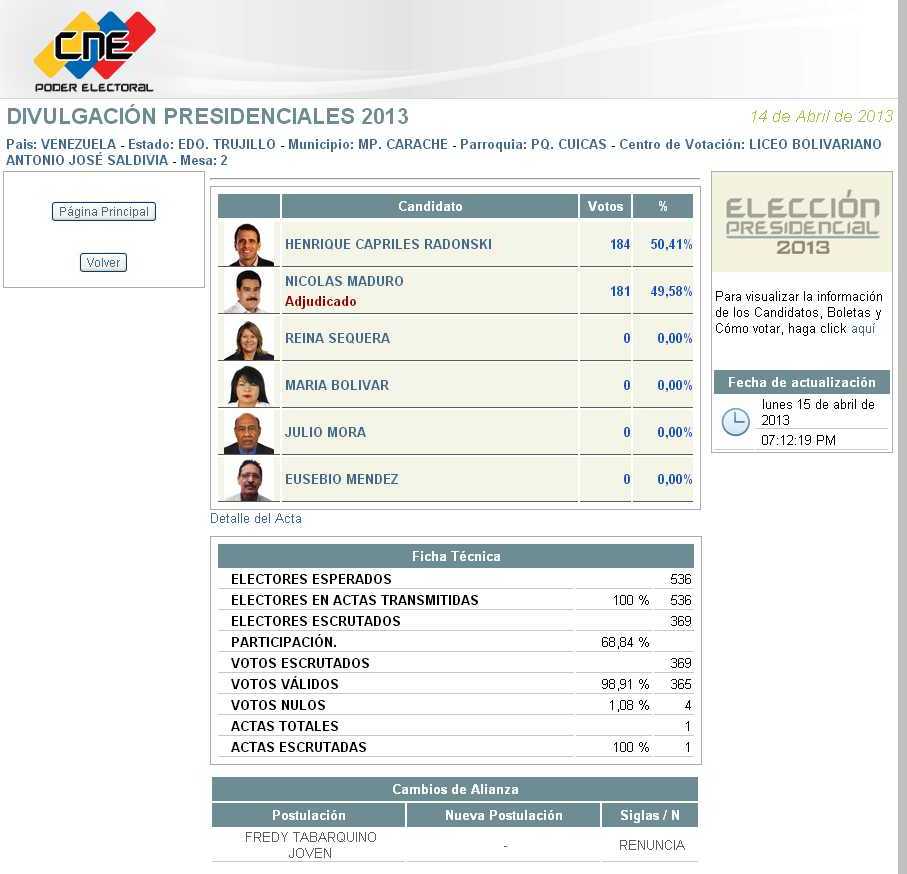 Capriles Radonski esgrimia como una de las pruebas del supuesto fraude una presunta irregularidad en el edo. Trujillo, Municipio Carache, parroquia Cuicas, Liceo Bolivariano Antonio José Saldivia. Según Capriles el acta de escrutinio indica "536 electores, según cuaderno", y en la constancia de verificación ciudadana decía "total de votos 717". Sin embargo, lo que Capriles no plantea es que 536 electores es el número de electores en la Mesa 2 del centro de votación, en la que se registraron 369 votos escrutados. La Mesa 1 registra 530 votos esperados y 343 votos escrutados.