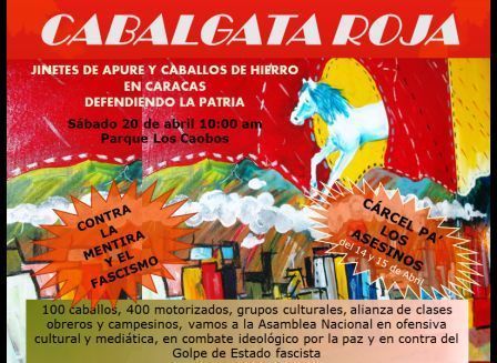 Caracas, 20 de abril de 2013.-: ¡Los valerosos llaneros y llaneras de Apure, junto a los caballos de hierro de Caracas, en la calle, defendiendo la patria! Se invita este sábado 20 de abril, desde las 11 AM desfilará una gran CABALGATA ROJA. La concentración será en parque Los Caobos (Caracas), para acompañar 100 jinetes en caballería, lanceros de Apure, que junto al pueblo tomarán las calles caraqueñas en marcha hacia la Asamblea Nacional.