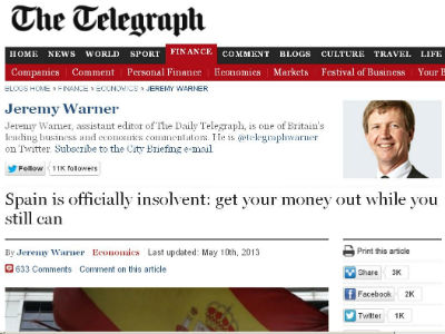 El diario británico The Telegraph lleva hoy en la portada de su página web un artículo en el que analiza la situación financiera de España, asegurando que es "oficialmente insolvente" y que lo más recomendable es "sacar el dinero mientras se pueda".