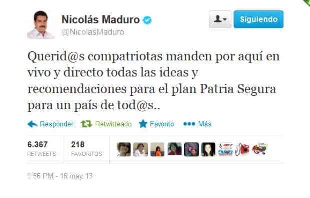 16 mayo 2013 - El Presidente de la República Bolivariana de Venezuela, Nicolás Maduro, a través de su cuenta oficial en Twitter, @NicolasMaduro, pide al pueblo enviar ideas y recomendaciones para el Plan Patria Segura.