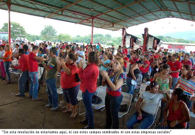 El 5 de marzo de 2009 el presidente Chávez recorrió esta zona de frontera entre los estados de Lara y Portuguesa, escuchó el reclamo de los pobladores sobre esas tierras improductivas, y ordenó expropiarlas para crear allí una Comuna Socialista. Había una historia de despojo detrás: en 1961, con la firma del Pacto de Punto Fijo por parte de los partidos de la llamada Cuarta República, los campesinos originarios habían sido desplazados de las mejores tierras y corridos a la montaña, desde donde regresaron para dar forma a la Comuna El Maizal. “Esto lo impulsó Chávez por su visión del futuro de las Comunas, no nos engañemos porque aquí no hubo como en otros sitios una ocupación primero, aquí nos organizamos después del impulso que Chávez nos dio”, reconoce Ángel Prado, en lo que bien puede entenderse como una metáfora de la forma en que avanzó durante 14 años toda la Revolución. El 29 de noviembre de aquel año el Comandante volvió al lugar para apoyar la iniciativa, e hizo su Aló Presidente desde el campo, alentando el autogobierno comunal. “Llegó, nos saludó, a mí me dice ´Hola Hilda, cómo te va, cuéntame tu historia´, y yo me preguntaba cómo el presidente sabía mi nombre, nerviosa, sin darme cuenta que lo llevaba pegado aquí en el cartel en el pecho”, recuerda Hilda Sánchez, que antes de la creación de la Comuna trabajaba limpiando casas de familias en la ciudad, apenas por la comida y alguna ropa usada como toda paga. “Yo le dije que la Comuna era la esperanza de un pueblo que nunca nos habían tomado en cuenta, y que era gracias a él, y así fuimos hablando uno por uno, como buenos amigos” recuerda. Se emociona: “fue el mejor maestro que he tenido para hacerme sentir como persona; lo que viví con Chávez y cada motivo de esta revolución que nos dejó él es una historia que nunca va a morir… Hablo y me duele el alma cuando lo recuerdo”. Y concluye: “Nos dijo que había que crear más comunas, y que cada una debía ser ejemplo para más comunas. Que nosotros mismos, aquí en la Comuna, debíamos ser el gobierno”.