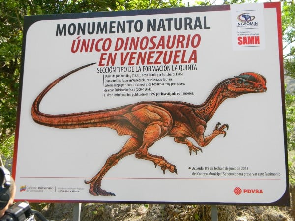 El pasado 14 de julio de 2013, comisiones del Instituto Nacional de Geología y Minería (INGEOMIN), el Servicio Autónomo de Metrología e Hidrocarburos (SAMH) y Petróleos de Venezuela (PDVSA), entes adscritos al Ministerio del Poder Popular de Petróleo y Minería, instalaron una valla en la carretera Seboruco – La Grita, con la finalidad de informar a los habitantes de estos municipios, turistas, estudiantes e investigadores que en ese sector se encuentra el Monumento Natural donde fueron encontrados fósiles del único dinosaurio en Venezuela, según publicaciones realizadas por parte de un equipo de investigadores franceses en 1992.