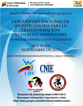 23 de octubre de 2013.- El Centro Internacional Miranda (CIM) con el apoyo y respaldo de la Universidad Bolivariana de Venezuela, El FONACIT y la Fundación Misión Sucre, convocan a la realización del I ENCUENTRO NACIONAL DE INVESTIGADORES POR LA TRANSFORMACION EDUCATIVA, a realizarse el 29 y 30 de noviembre del año 2013 en las instalaciones de la UBV.