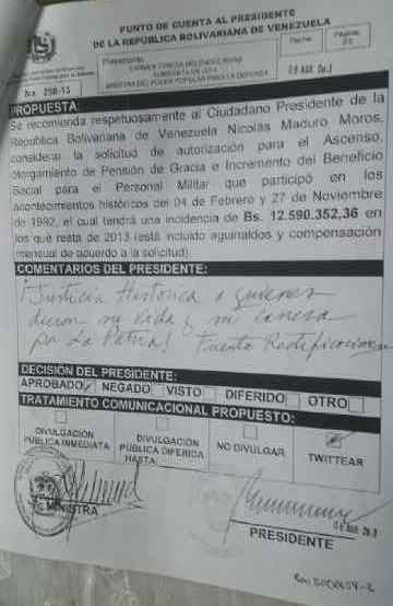 Se incluye copia de la Resolución ministerial 02660 donde según palabras de la directora del Despacho del Ministerio del Poder Popular para la Defensa, Contra-Almirante Celsa Bautista, están los más necesitados socialmente. Se puede verificar la lista ... Por otra parte la decisión del Tribunal 8vo fue de "incompetencia" y se remitió el expediente a la Sala Constitucional (Documento lo posee el Doctor Américo Gutiérrez)... la semana pasada estuvimos un grupo de 250 combatientes, el día 23-10-2013; luego desfilamos hasta la Asamblea y Miraflores, trancando la Avenida por más de 3 horas, por no haber tenido ninguna respuesta... Las impresiones de los y las combatientes que perdimos Carrera militar y otros hasta sus propias vidas en la construcción de la V republica y hoy están en el abandono, son de total descontento y desaprobación a la injusticia.