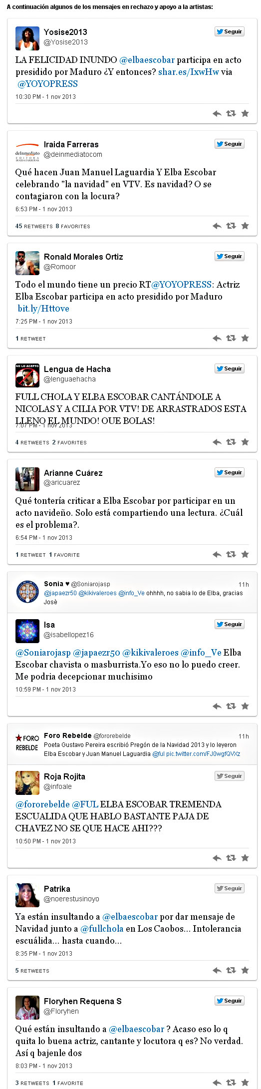 No se había bajado de la tarima los artistas cuando el Twitter se encendió con las críticas y reacciones por la participación de Escobar. En algunos mensajes la tildaron de “arrastrada” y sugirieron que el Gobierno de Maduro ya la había comprado. La mayoría de la comunidad venezolana respondió rechazando estas muestras de intolerancia.