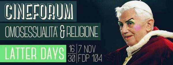 18-11-13.-La publicidad en la que aparece la imagen retocada del papa emérito Benedicto XVI con maquillaje para promocionar el festival cinematográfico sobre homosexualidad y religión organizado en la Universidad Estatal de Milán (Italia) ha levantado numerosas críticas.