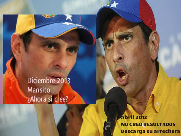 10 Dic. 2013 - Vea cómo el "gobernador" de Miranda, Henrique Capriles cambia el discurso luego de saberse derrotado primero el pasado 14 de abril en las elecciones presidenciales y ahora, este domingo 8 de diciembre en las elecciones municipales.