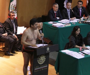 13-12-13.-Una mezcla de asombro e hilaridad campeó la madrugada del jueves en la Cámara de Senadores, en el momento que el diputado Antonio García Conejo (PRD) se quitó la ropa y quedó semidesnudo, cubierto apenas por una trusa rojinegra, para denunciar –dijo– el despojo que representa la reforma constitucional en materia energética.