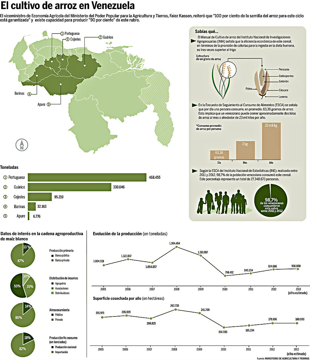 Portuguesa, Guárico, Cojedes, Barinas y Apure aparecen como los estados de nuestra geografía donde se produce la mayor cantidad de arroz.