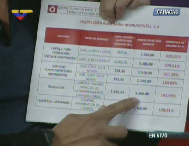 Desde la sede de su despacho, y acompañado de Karlín Granadillo, Superintendente Nacional de Costos y Precios (Sundecop), el mayor general advirtió que esta empresa funeraria cobra incluso “alquiler” de capillas velatorias por 6, 12 y 24 horas, con precios excesivos, lo cual evidencia que no están interesados en ofrecer un servicio humano, justo y de calidad, sino en usar el servicio como "negocio financiero" que dé ganancias inmediatas.