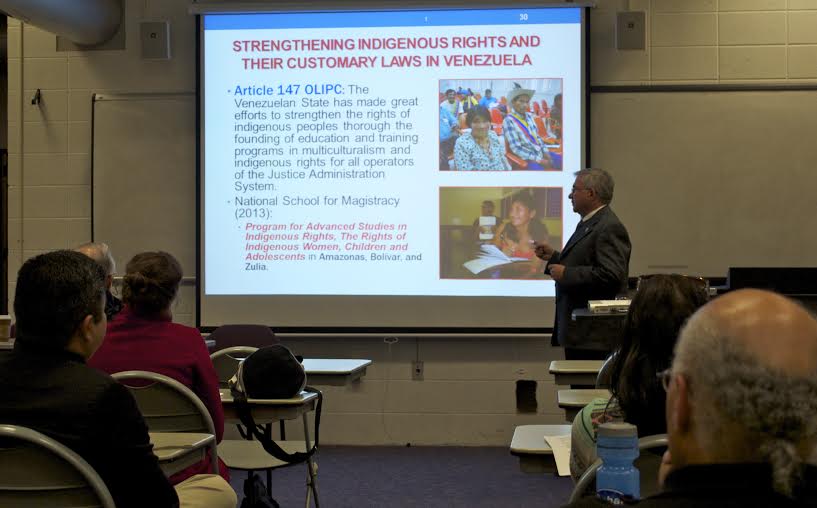 Con este propósito se realizaron una serie de conferencias en la Universidad de Massachusetts en Boston, donde fue ponente, el Dr. Ricardo Colmenares Olivar; Juez Superior (retirado) de la Corte de Apelaciones del Estado Zulia; Profesor Titular de la Facultad de Ciencias Jurídicas y Políticas de la Universidad del Zulia; Investigador Libre de la Sección de Antropología Jurídica del Instituto de Filosofía del Derecho y Coordinador de la Maestría Latinoamericana en Ciencias Penales y Criminológicas de esa casa de estudios.