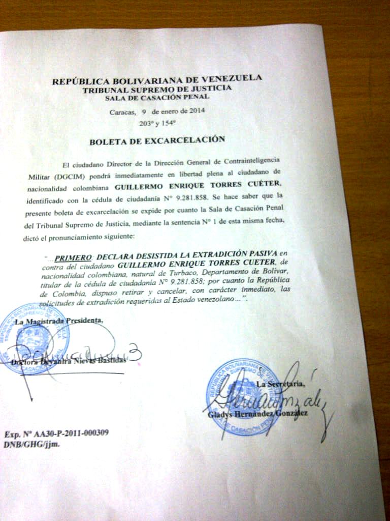 En la misma fecha el canciller venezolano, Elías Jaua Milano, envió una misiva a la presidenta del Tribunal Supremo de Justicia, magistrada Gladys María Gutiérrez Alvarado, en la que informó que el Gobierno de Colombia decidió retirar la solicitud de extradición hecha sobre Guillermo Enrique Torres Cueter, para que en consecuencia se actúe en el ámbito de sus competencias.
