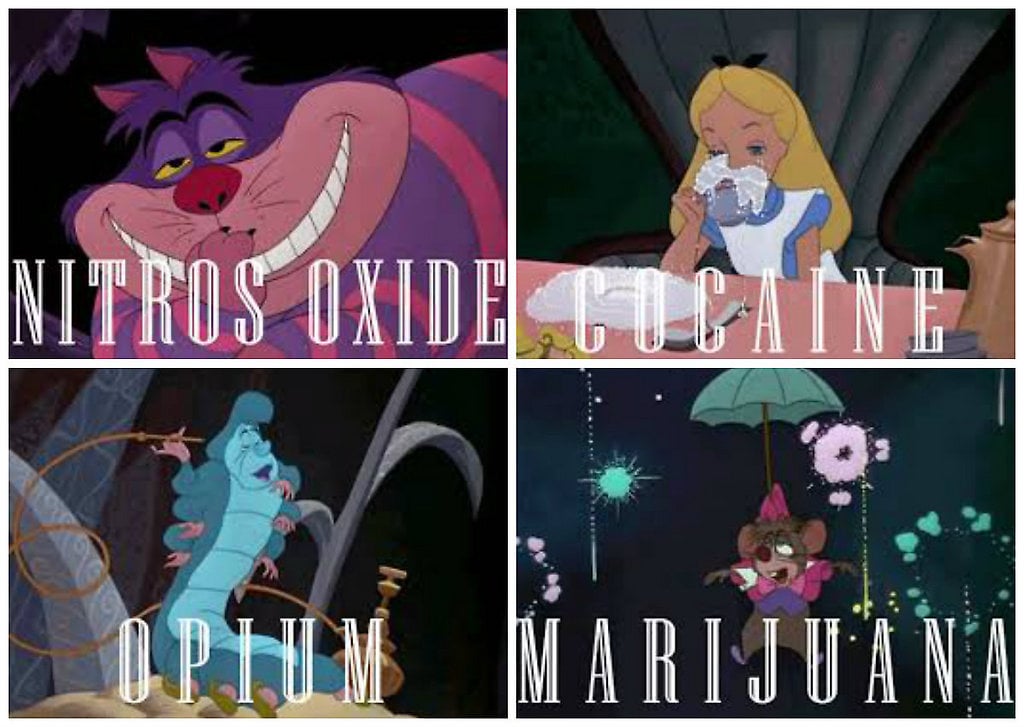Lo cierto es que muchos han apreciado en las setas mágicas ingeridas por la protagonista, el narguile que fuma la oruga o la sonrisa suspendida en el aire del gato de Cheshire, referencias claras a las drogas. Esta lectura de la obra fue especialmente popular durante los años 60, cuando hacían furor el LSD y otros psicotrópicos. Pero la mayoría de los expertos en la novela, que tuvo su continuación con Alicia a través del espejo (1871), no quieren ni oír hablar de esta posibilidad, pues simplemente ven un derroche de imaginación con el único objetivo de entretener.