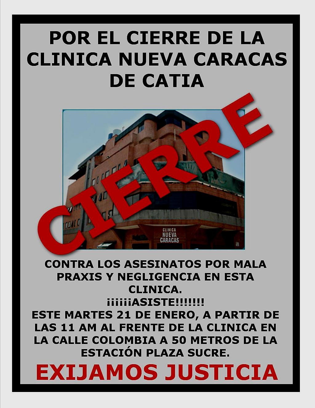 Nosotros el pueblo venezolano no permitiremos que unos pocos se sigan enriqueciendo a costa de la vida de muchos, por lo tanto solicitamos al Presidente Nicolás Maduro, a la Asamblea Nacional, al Ministerio Público y a la Defensoría del Pueblo, cárcel para la directiva y los dueños de este centro de salud privado y el cierre definitivo de la Clínica “Nueva Caracas”.