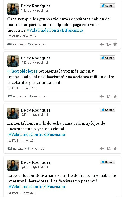 13 de febrero de 2014.- La ministra del Poder Popular para la Comunicación y la Información, Delcy Rodríguez Gómez, manifestó a través de su cuenta oficial en la red social Twitter, @DrodriguezMinci, que las acciones del dirigente de la ultraderecha venezolana, Leopoldo López, militan entre la cobardía y la criminalidad.