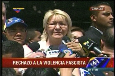 Caracas, febrero 13 - La fiscal general de la República, Luisa Ortega Díaz se pronunció nuevamente este jueves desde la sede del Ministerio Público, sobre los hechos violentos ocurridos ayer y aseguró “no tenemos miedo, si vamos a tener justicia pero no puede adaptarse a los caprichos de un ‘grupito’ de personas perturbadoras”.