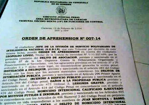13 Feb. 2014 - El ministro del Poder Popular para la Transformación Urbana de Caracas, Ernesto Villegas Poljak, confirmó esta tarde la veracidad de una orden de captura emitida contra el líder del partido Voluntad Popular, Leopoldo López, quien instigó a las protestas violentas ocurridas el pasado miércoles, por las cuales hubo 3 personas fallecidas y varias decenas de heridos. La Fiscal General nos confirmó la veracidad de la orden de captura contra Leopoldo López, indicó en entrevista en el programa Contrataque de Alba Ciudad este jueves.