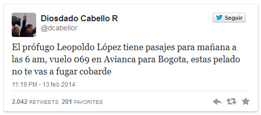 14 Feb. 2014 - El presidente de la Asamblea Nacional, Diosdado Cabello, aseguró en la noche de este jueves que el dirigente contrarevolucionario Leopoldo López, se intentaría fugar de Venezuela mañana viernes en un vuelo de Avianca 069 con destino Bogotá, Colombia.