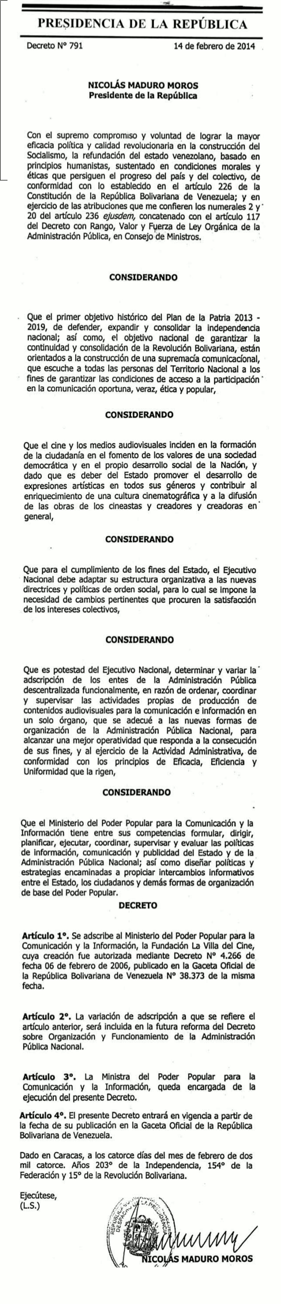 Caracas, febrero 18 - Según señala la Gaceta Oficial número 40.357 de este martes en su Decreto 791, se adscribe al Ministerio del Poder Popular para la Comunicación y la Información, la Fundación La Villa del Cine, cuya creación fue autorizada mediante Decreto N° 4.266 de fecha 06 de febrero de 2006, publicado en la Gaceta Oficial de la República Bolivariana de Venezuela N° 38.373 de fecha 06 de febrero de 2006. Esta variación de adscripción, será incluida en la futura reforma del Decreto sobre Organización y Funcionamiento de la Administración Pública Nacional.