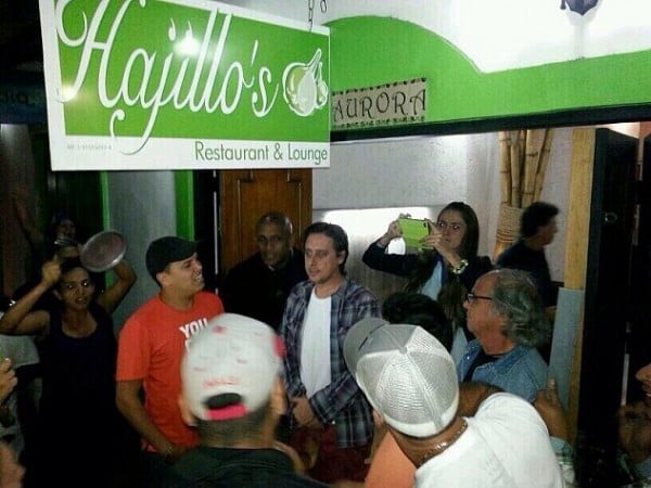 08-03-14.-Los actores Jorge Reyes y Roque Valero; sus parejas, la actriz colombiana Alejandra Sandoval y la presentadora Kenyú Suárez, de Venezolana de Televisión, fueron agredidos este viernes en la noche mientras cenaban en el restaurant Hajillo’s ubicado en el municipio El Hatillo, en el sureste de Caracas. Con cacerolas, gritos y una actitud bastante irracional, un grupo de habitantes de la zona les impidieron salir del local por varias horas, situación que requirió del apoyo de la policía del estado. El que Valero y Suárez estuviesen con su hijo pequeño no ayudó a que se les tratara mejor.
