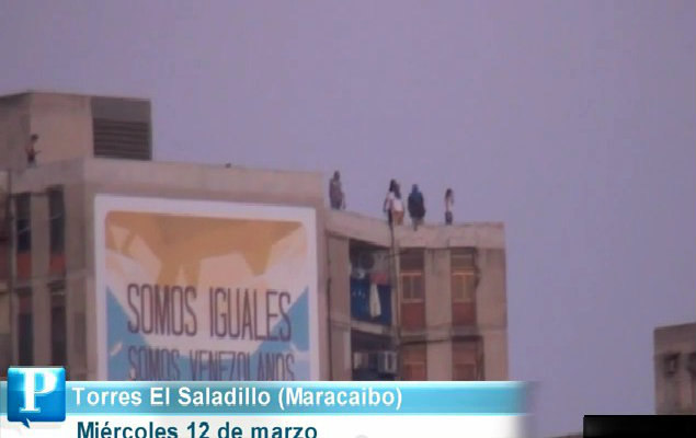 13 Mar. 2014 - Las cámaras de PANORAMA lograron captar barricadas en la vía, custodiada a distancia por motorizados del Cpbez. Además, otro grupo de personas, algunas encapuchadas, se encontraban en la azotea de las Torres.