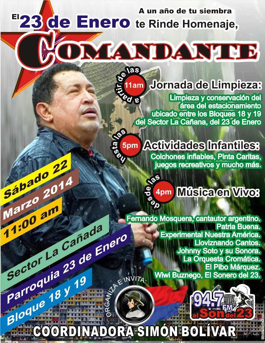 La Coordinadora Simón Bolívar, junto a diversas organizaciones comprometidas con el proceso revolucionario, invita al público en general a asistir, este Sábado 22 de marzo de 2014, a partir de las 11:00 am, a una actividad, para rendirle Homenaje a nuestro Comandante Supremo, al conmemorarse un año de su siembra, y la cual se desarrollará de la siguiente manera: