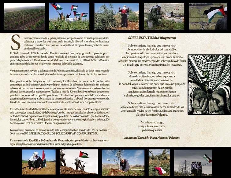 Asiste este viernes 28 de marzo a la conmemoración del Día de la Tierra Palestina, a las 3:30 pm en la Casa Amarilla, Caracas. Y forma parte de este movimiento de solidaridad internacional. Tu presencia es importante!